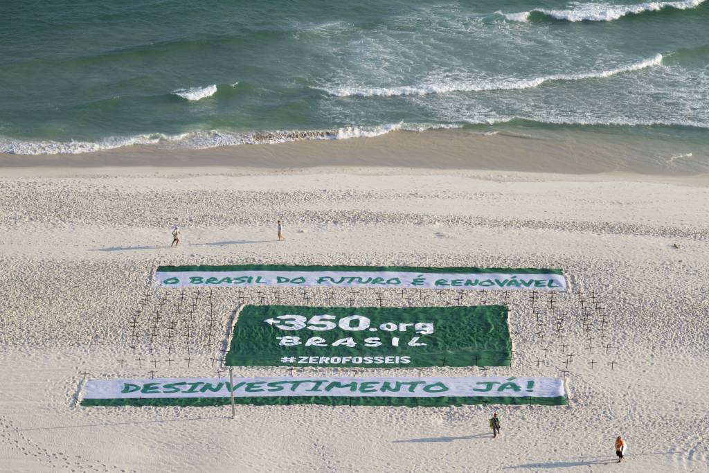 Manifestação organizada pela 350.org Brasil e COESUS, com apoio de Uma Gota no Oceano, contou com cruzes negras na areia e bandeiras gigantes com mensagens contra os combustíveis fósseis