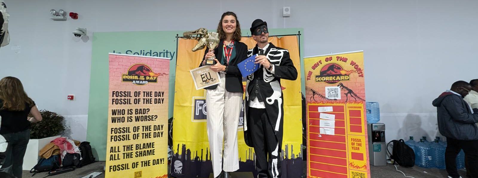 DO OC – Nesta quarta-feira (20), a União Europeia foi honrada com o “Fóssil do Dia”, prêmio simbólico concedido pela Climate Action Network (CAN) para países e grupos que mais prejudicam as negociações durante as conferências do clima. A escolha foi motivada por informações de que o bloco está defendendo um financiamento climático anual entre US$ 200 bilhões e US$ 300 bilhões nas negociações da 29ª Conferência das Partes da Convenção do Clima das Nações Unidas (COP29), realizada em Baku, Azerbaijão.